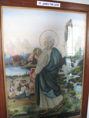 I guess the figure in steel rails is St. Thomas seen above him is Christ blessing folks that come in.